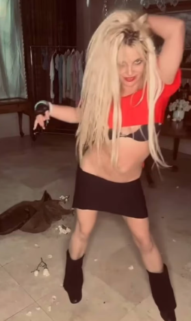 En uno de los videos, Spears baila al ritmo de “Bad Guy”, de Billie Eilish, luciendo un crop top rojo brillante que dejó al descubierto su sujetador negro en varios momentos, una minifalda negra, botas hasta la pantorrilla y un largo abrigo de cuero beige.