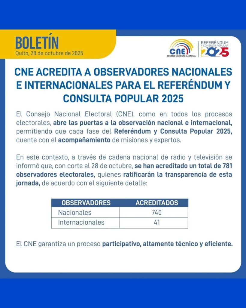 El Consejo Nacional Electoral (CNE) de Ecuador confirmó la acreditación de 781 observadores electorales para el próximo Referéndum y Consulta Popular 2025, con el objetivo de garantizar la transparencia de la jornada.