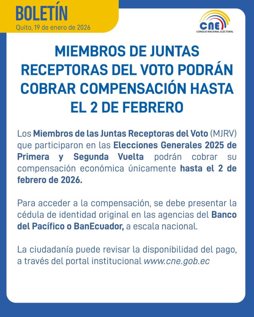 Para recibir el pago, los beneficiarios deben presentar su cédula de identidad original en cualquier agencia del Banco del Pacífico o BanEcuador, a nivel nacional. Además, pueden verificar la disponibilidad del pago en el portal oficial del CNE: www.cne.gob.ec.
