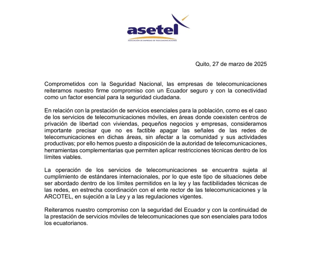 Comprometidos con la Seguridad Nacional, las empresas de telecomunicaciones reiteramos nuestro firme compromiso con un Ecuador seguro y con la conectividad como un factor esencial para la seguridad ciudadana.