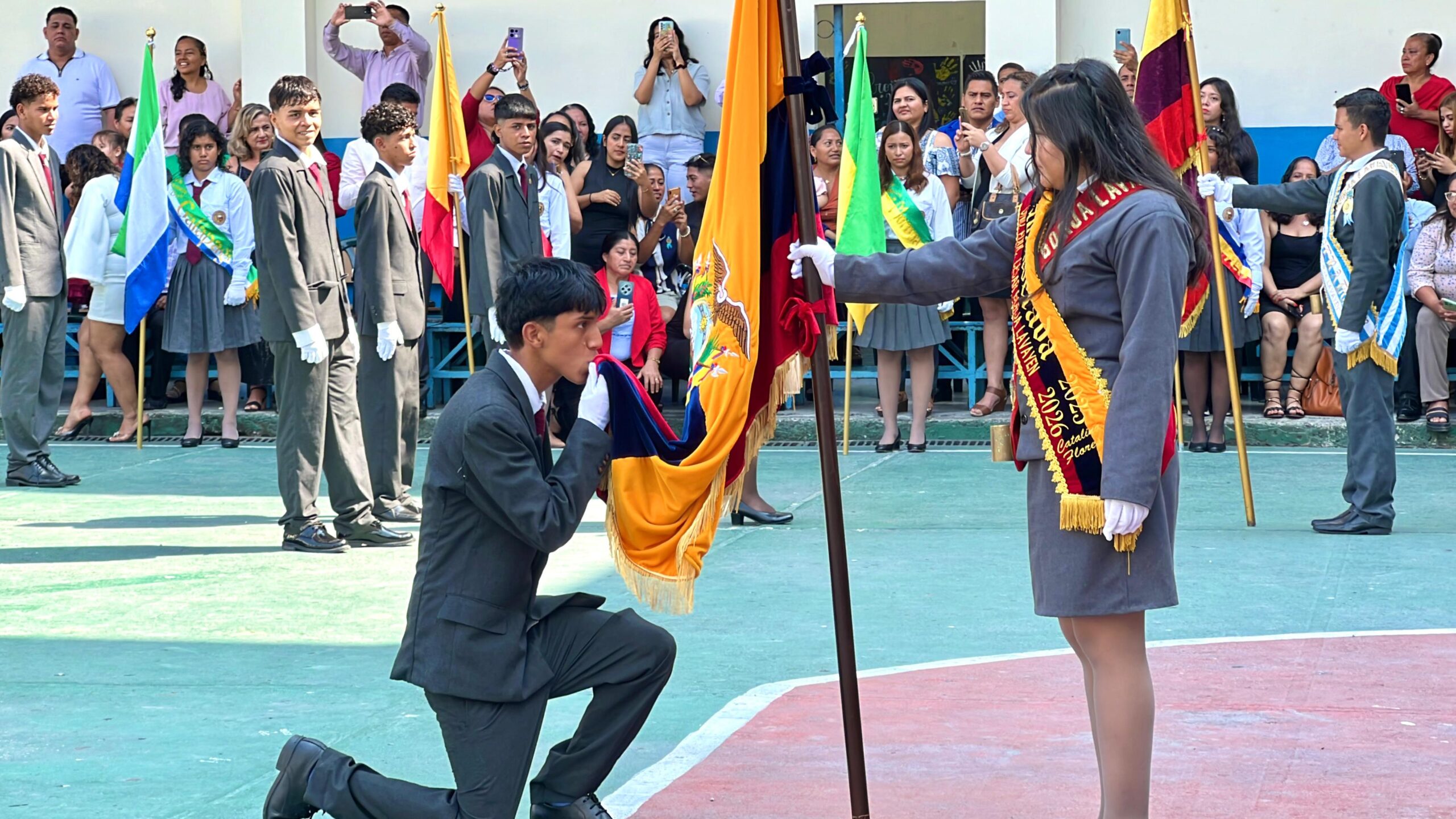 La ceremonia central se realizó en la Unidad Educativa Fiscal César Borja Lavayen, con la presencia de autoridades locales, docentes y familias. Catalina del Rosario Flores, abanderada con promedio de 9.85, destacó la importancia de ser ejemplo e inspiración para su generación.