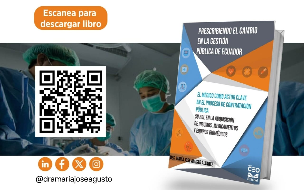 “Prescribiendo el Cambio en la Gestión Pública de Ecuador”, libro que destaca la importancia de la participación de los médicos en la contratación pública debido a su conocimiento especializado y su impacto en la calidad de la atención médica, garantizando la selección adecuada de productos, una óptima relación costo-beneficio y la eficiencia financiera.