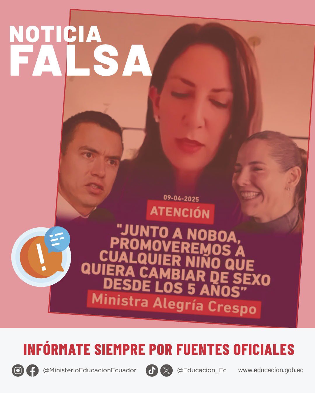 🚨 ¡Atención! Están circulando noticias falsas utilizando inteligencia artificial, suplantando la identidad de la ministra @AlegriaCrespo.