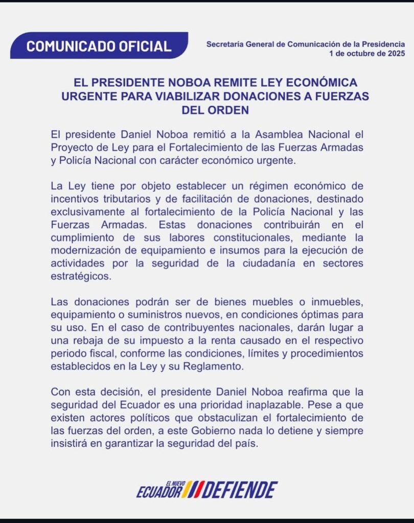 El presidente Daniel Noboa envió a la Asamblea Nacional un proyecto de ley con carácter económico urgente para fortalecer a la Policía Nacional y las Fuerzas Armadas.