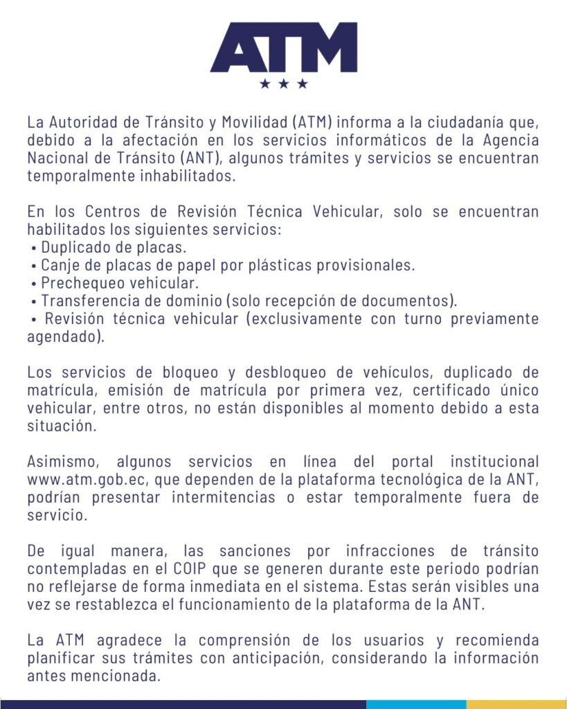 La ATM advirtió que algunos servicios en línea del portal web, que dependen del sistema de la ANT, podrían presentar intermitencias o estar temporalmente fuera de servicio. Además, las multas de tránsito impuestas durante este período podrían no reflejarse de forma inmediata en el sistema, y podrán ser consultadas una vez se restablezcan los servicios.