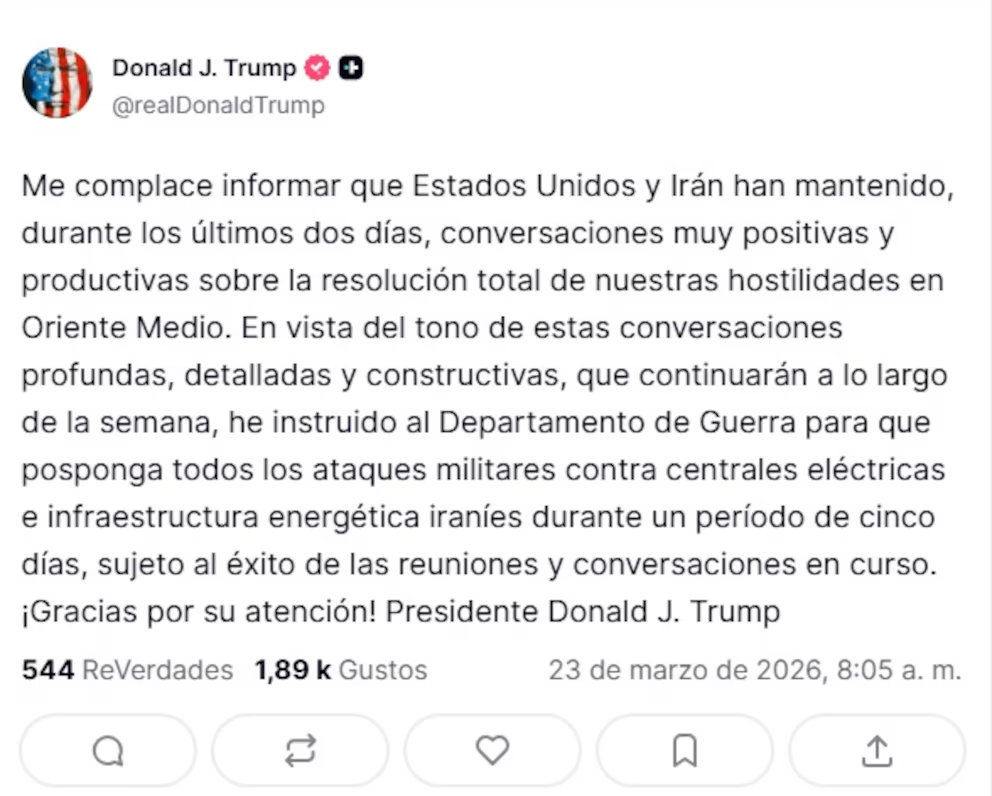 El presidente de Estados Unidos, Donald Trump, anunció este lunes la suspensión por cinco días de todos los ataques militares previstos contra la infraestructura energética de Irán. A través de su red social Truth Social, el mandatario calificó los diálogos de las últimas 48 horas como «profundos y constructivos», señalando que buscan una resolución total de las hostilidades en Medio Oriente.